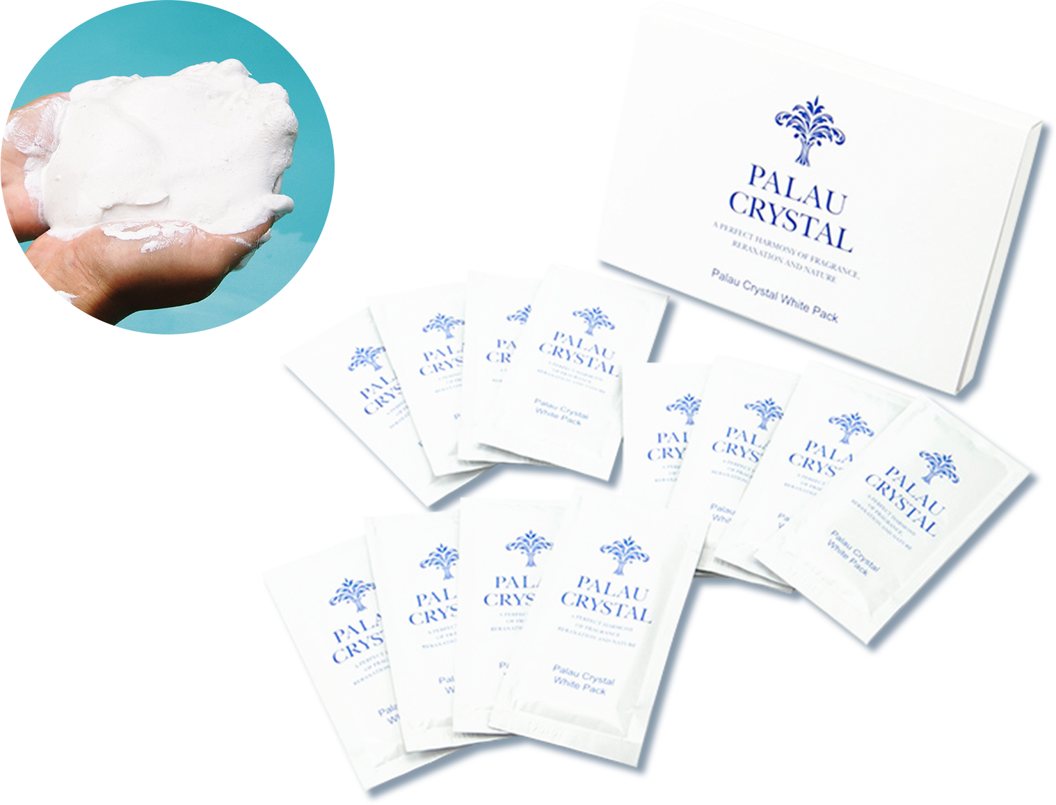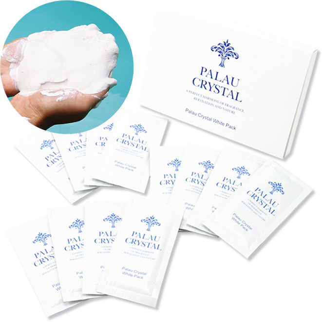 ミルキーウェイの名称で親しまれているパラオのウルクターブル島から採取された天然の粘土で、保湿、保潤作用があります。現地では白泥には人の肌を癒し、すべすべにする不思議な力があると伝承されています。パラオクリスタルホワイトパックはパラオ政府より唯一公認されている正規輸入白泥を使用しています。